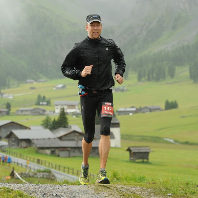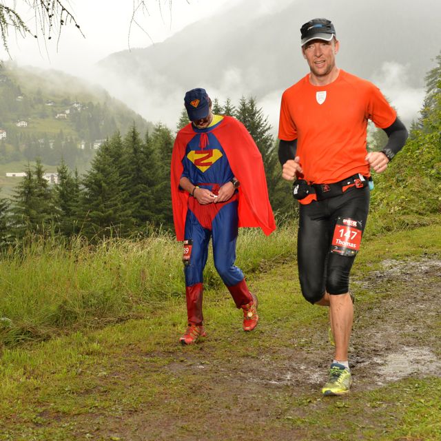 Och då kommer regnet. Ett regn som kommer att bli min och alla andra löpares följeslagare under resten av den långa dagen. Ett regn som gör det ganska glest i publikleden – men som inte stoppar de som väl letat sig ut för att göra sitt yttersta för att heja fram oss löpare. Ett regn som gör vissa delar av banan till rena lervällingsbäckarna och som får stenarna på de mäktiga bergen obehagligt, oberäkneligt hala. Ett regn som får mina bröstvårtor att styvna och skava lätt mot tröjan så att jag efter drygt tre mils löpning blir tvungen att göra en längre paus i ett sjukvårdstält, roffa åt mig en leukoplast-tejprulle och försöka få fast de avrivna tejpbitarna på den lätt håriga, och fullkomligt genomblöta bringan. Ett regn som får mig att nästan, men bara nästan, tappa sugen i Bergün (43k) och vid ett mikroögonblick fundera på att hoppa av och få en officiell sluttid i C42-klassen istället. Ett regn som sedan nästan helt glöms bort och som istället blir en blöt och kär vän genom de pittoreska byarna och över det väldiga berget.