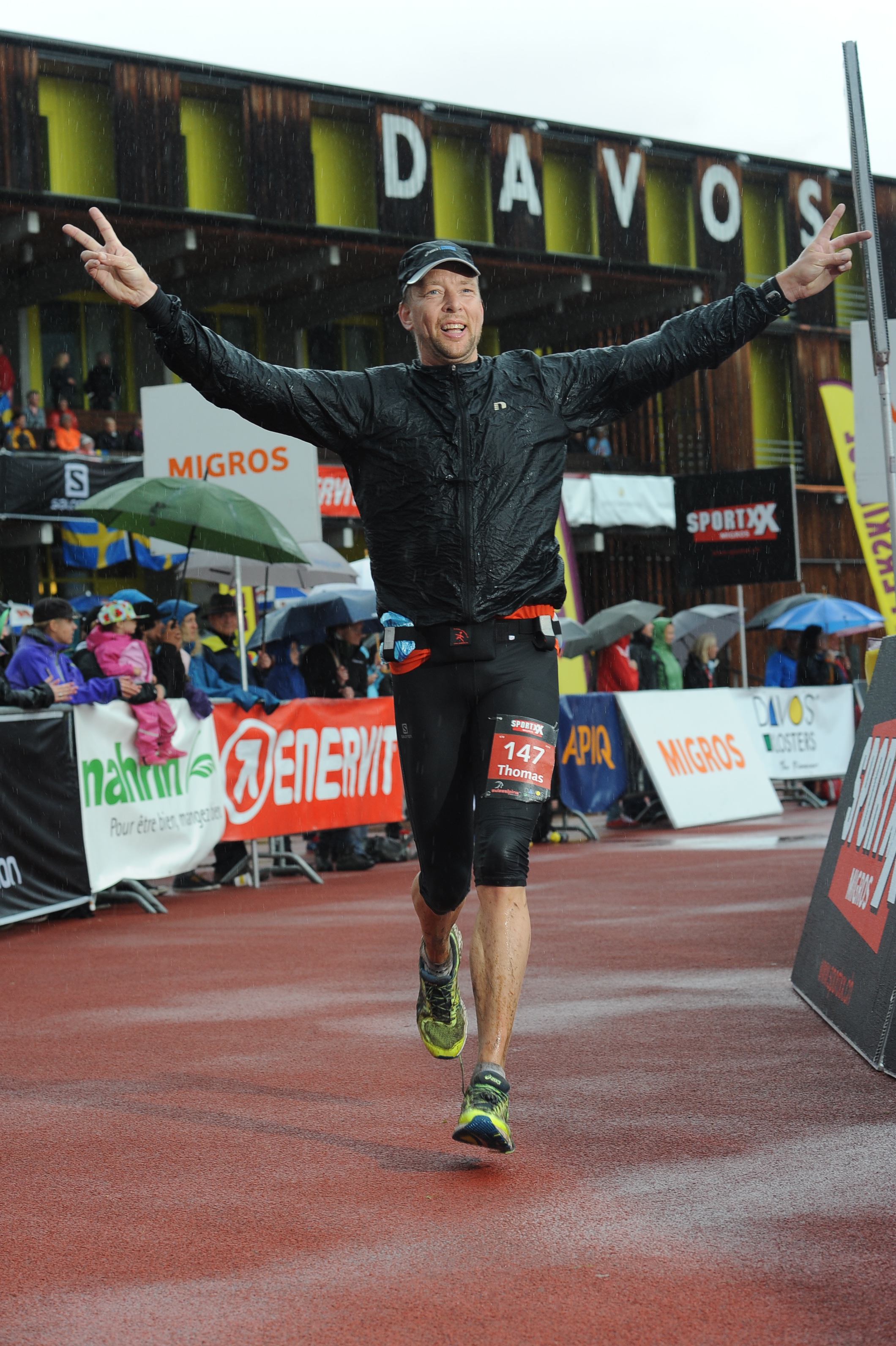 Kommer ner till byn. Får spontana och ärliga handklapp från några veteraner som en välkomstpresent, närmar mig Talstraße och tar den sista lilla uppförsbacken som i fjol tvingade mig från löpning till gång i ett fåtal lätta och snabba kliv, viker höger och hör speakerns röst som ekat över dalen och upp i bergen många kilometer från mål bli starkare och starkare. Smiter in genom porten till Sportzentrum, njuter av känslan av tartanen som lyfter mig framåt som sprang jag på fluffiga, roströda små moln. Tar emot den glesa, paraplyskylande och tappra publikens hejarop och jubel, sträcker armarna i skyn och formar de stelfrusna händerna i dubbla V-tecken, hör ett par skratt i kurvan och mitt namn i högtalarna. Ler, skrattar, lever. Springer över den sista mattan, hör dagens sista chip-pip och känner mig som en oändligt lycklig vinnare där i regnet, även om 238 gubbar före mig korsat den där magiska linjen.